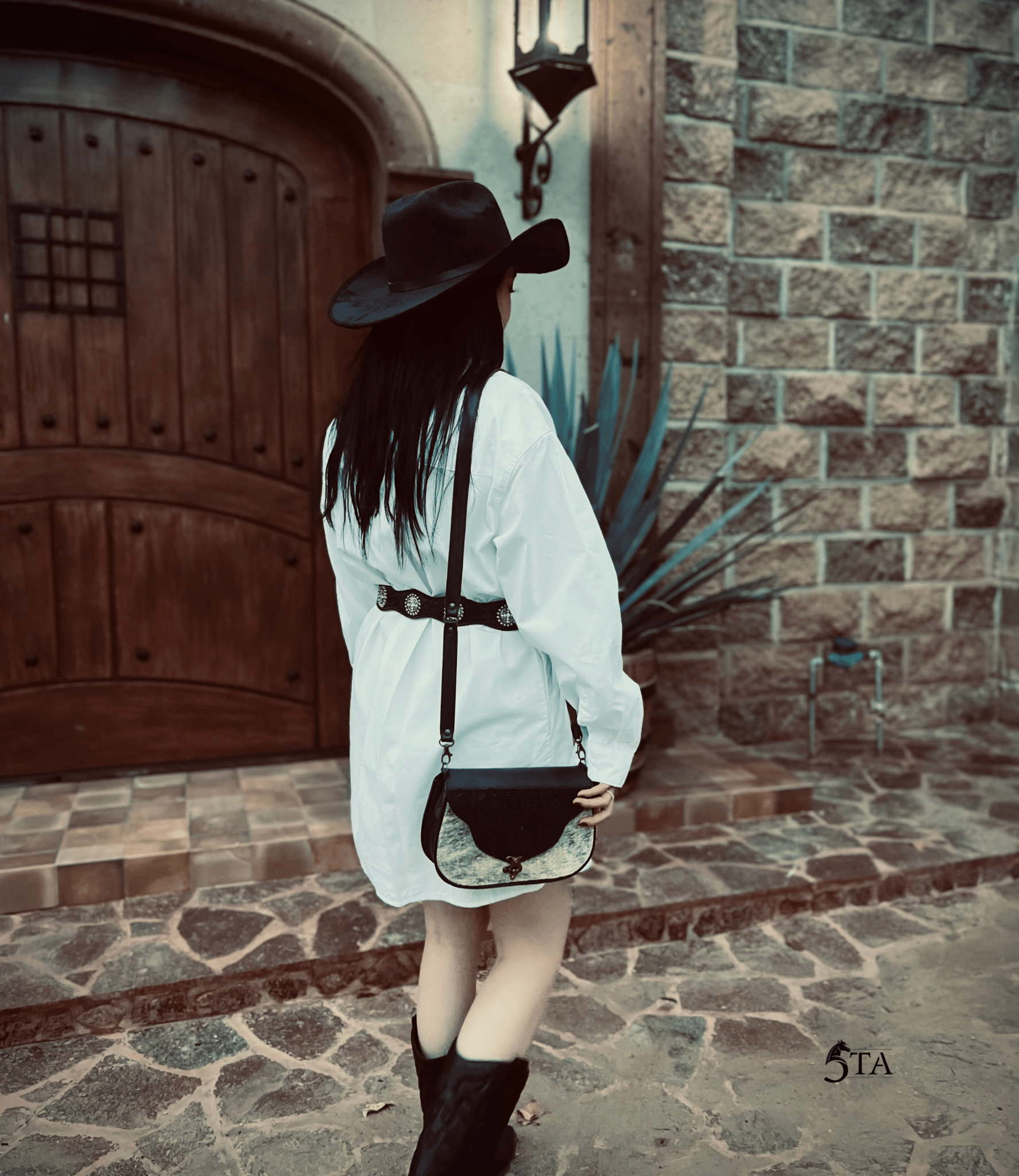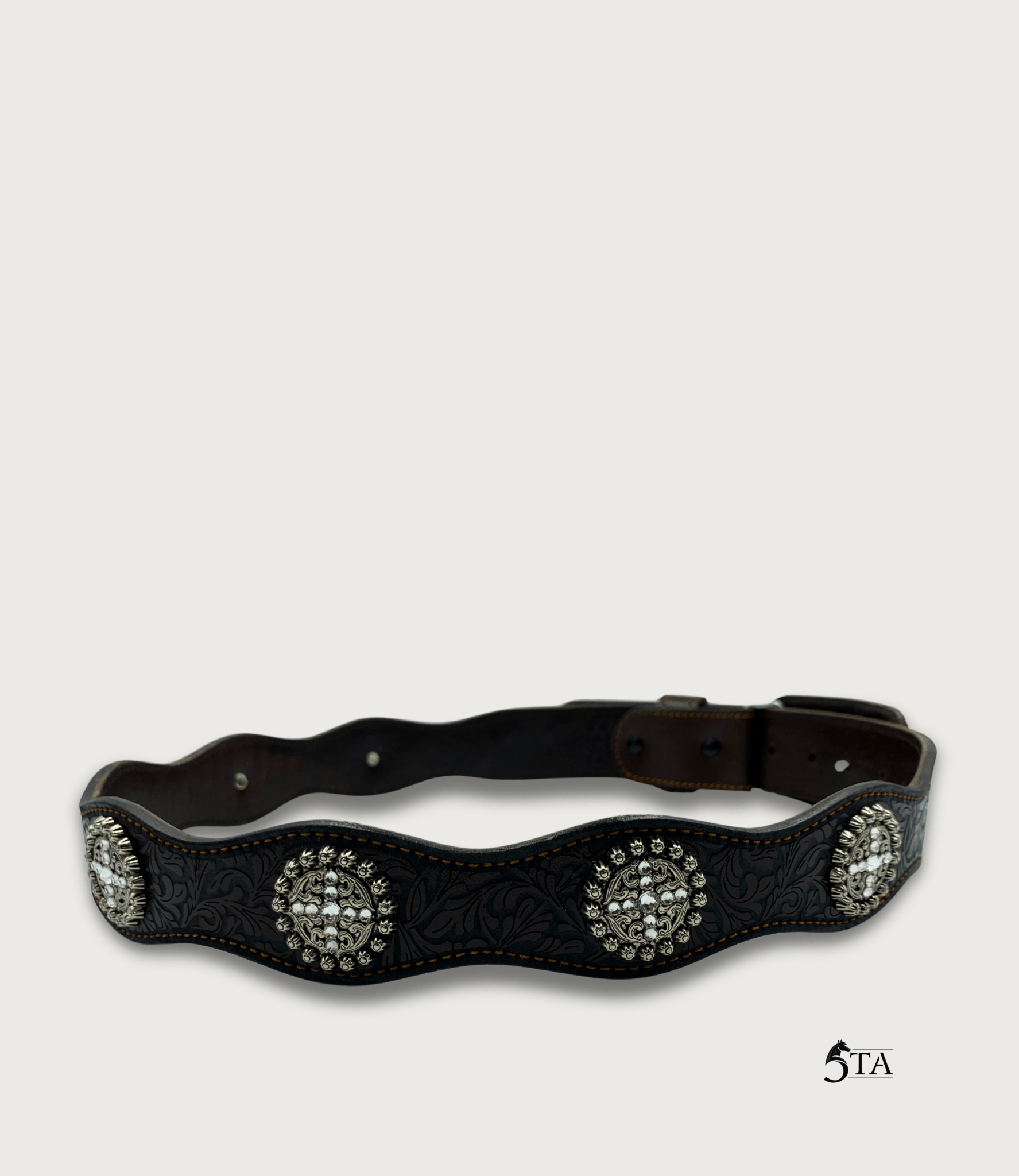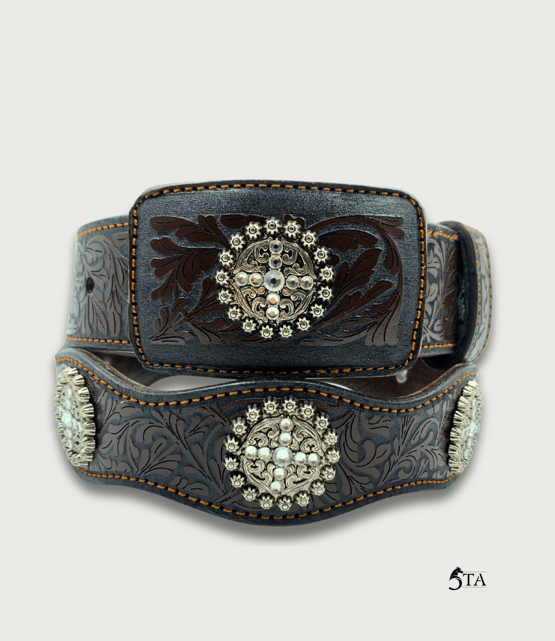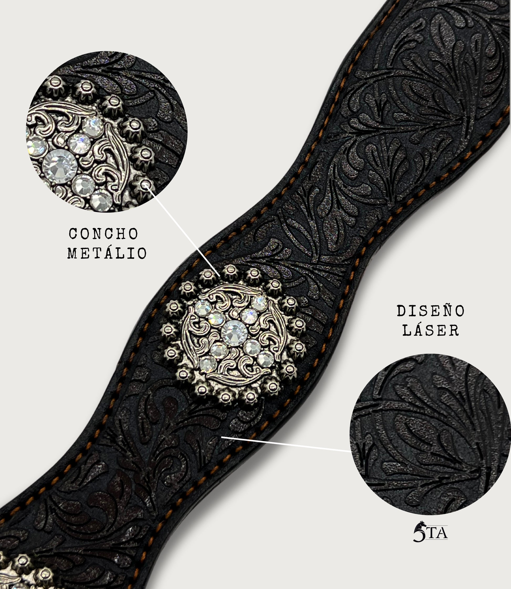 El grabado a máquina láser y la creatividad del artesano mexicano se unen para crear un cinto único. Con diseño de guía española y conchos metálicos de piedra, hacen que cada estilo vaquero resalte aun más. Elaborado con materiales originales y de alta calidad