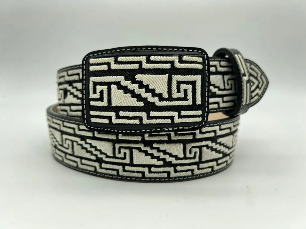 Este cinto no se fabrica en serie — se borda punto a punto. El diseño Media Greca y Azteca combina dos de los patrones más icónicos de la artesanía mexicana en una sola pieza de piel vaqueta genuina con pita 100% original. Cada uno sale diferente porque cada uno lo termina una sola persona, a mano, en México.