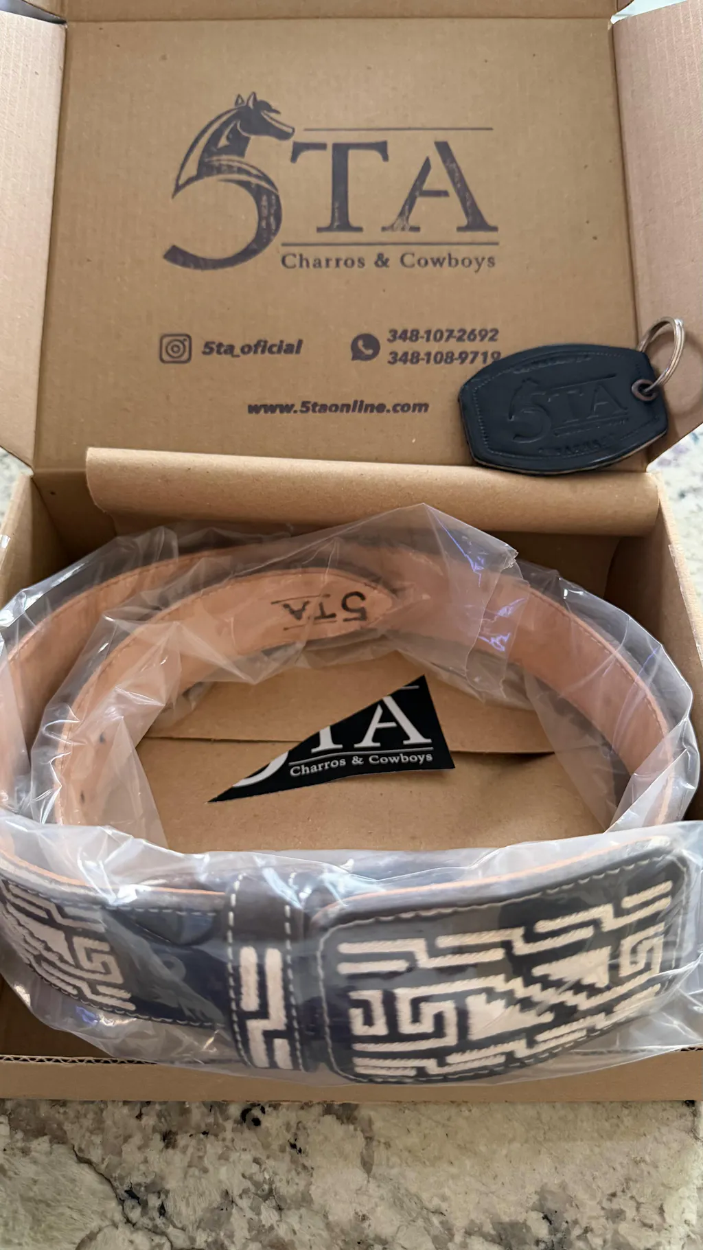El bordado no es estampado ni láser — es pita natural cosida a mano, punto a punto. El que entiende de cintos lo distingue en el primer vistazo.