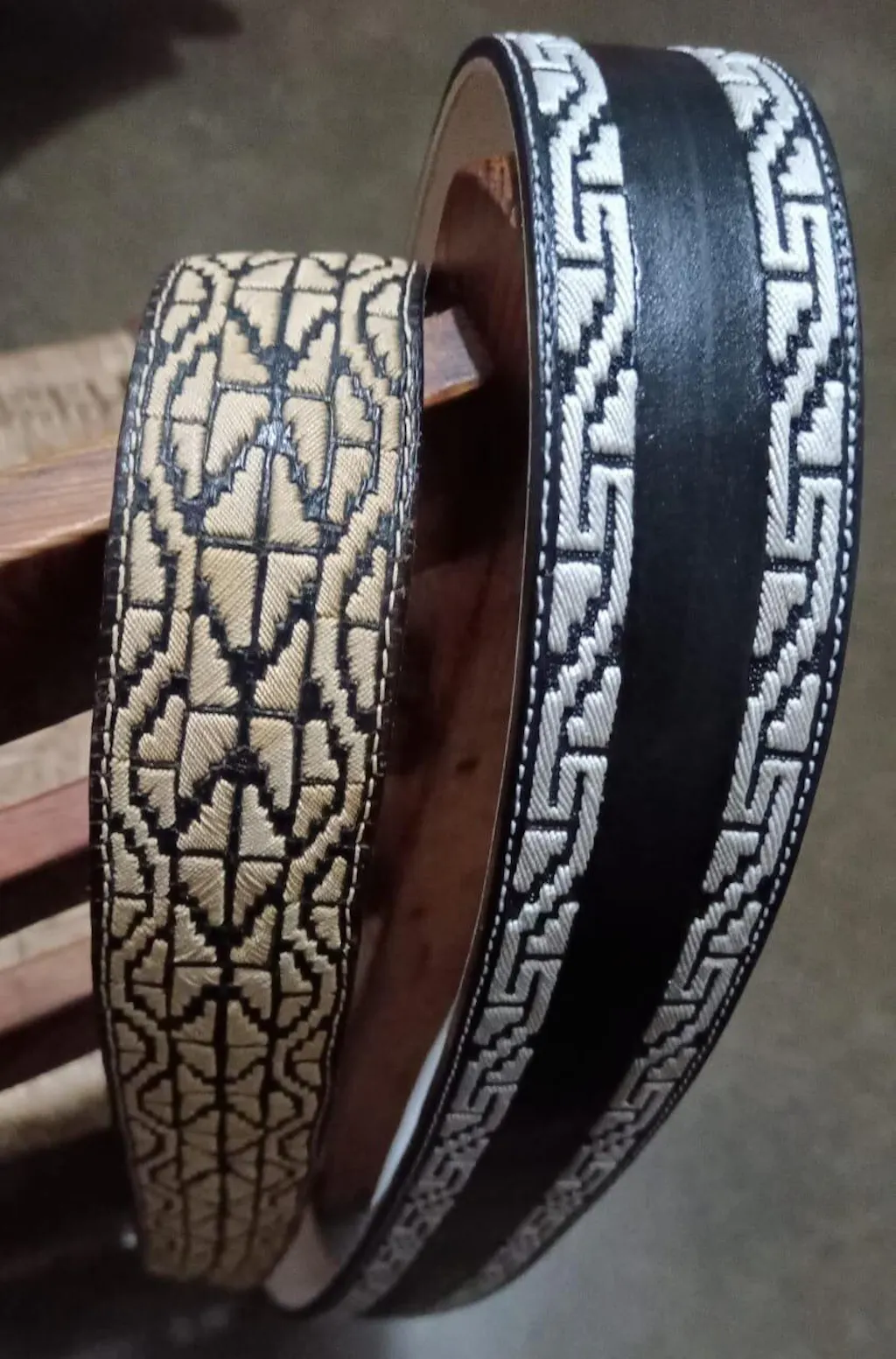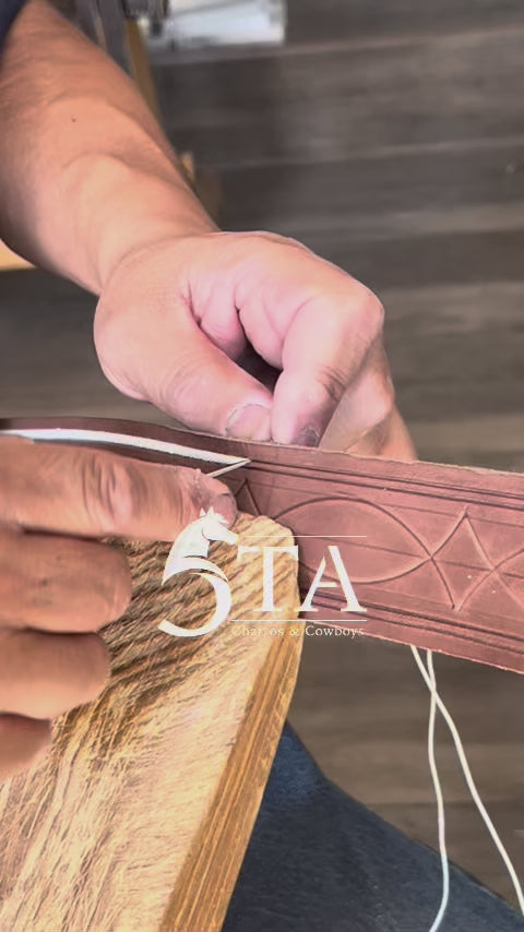El bordado no es estampado ni láser — es pita natural cosida a mano, punto a punto. El que entiende de cintos lo distingue en el primer vistazo.