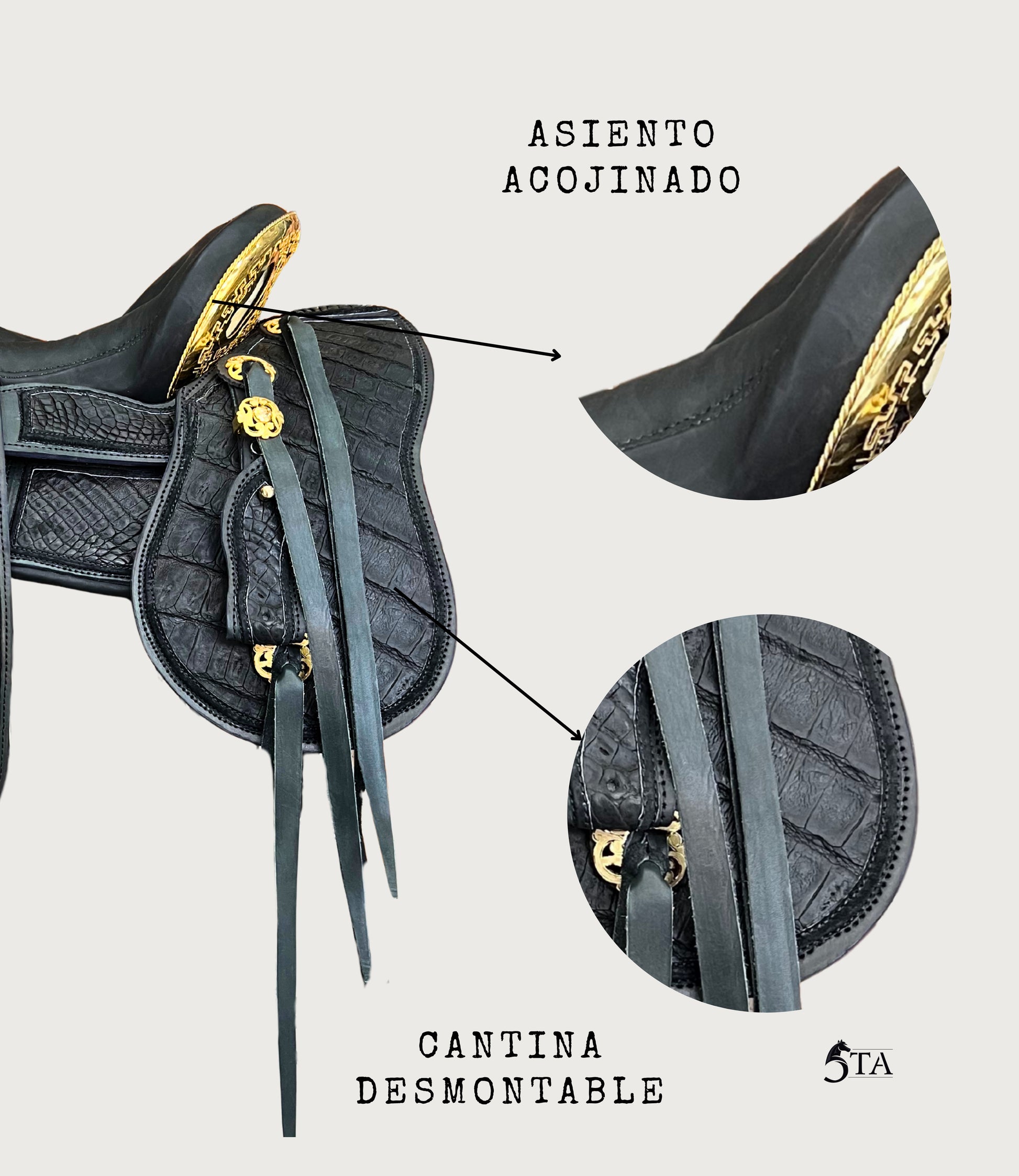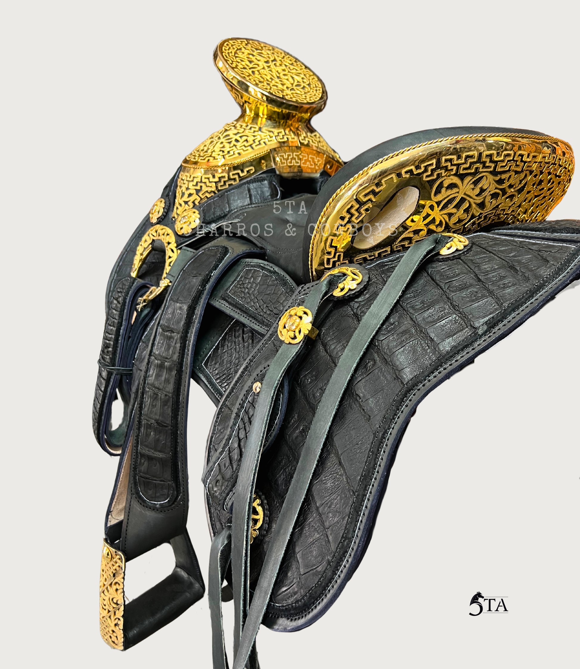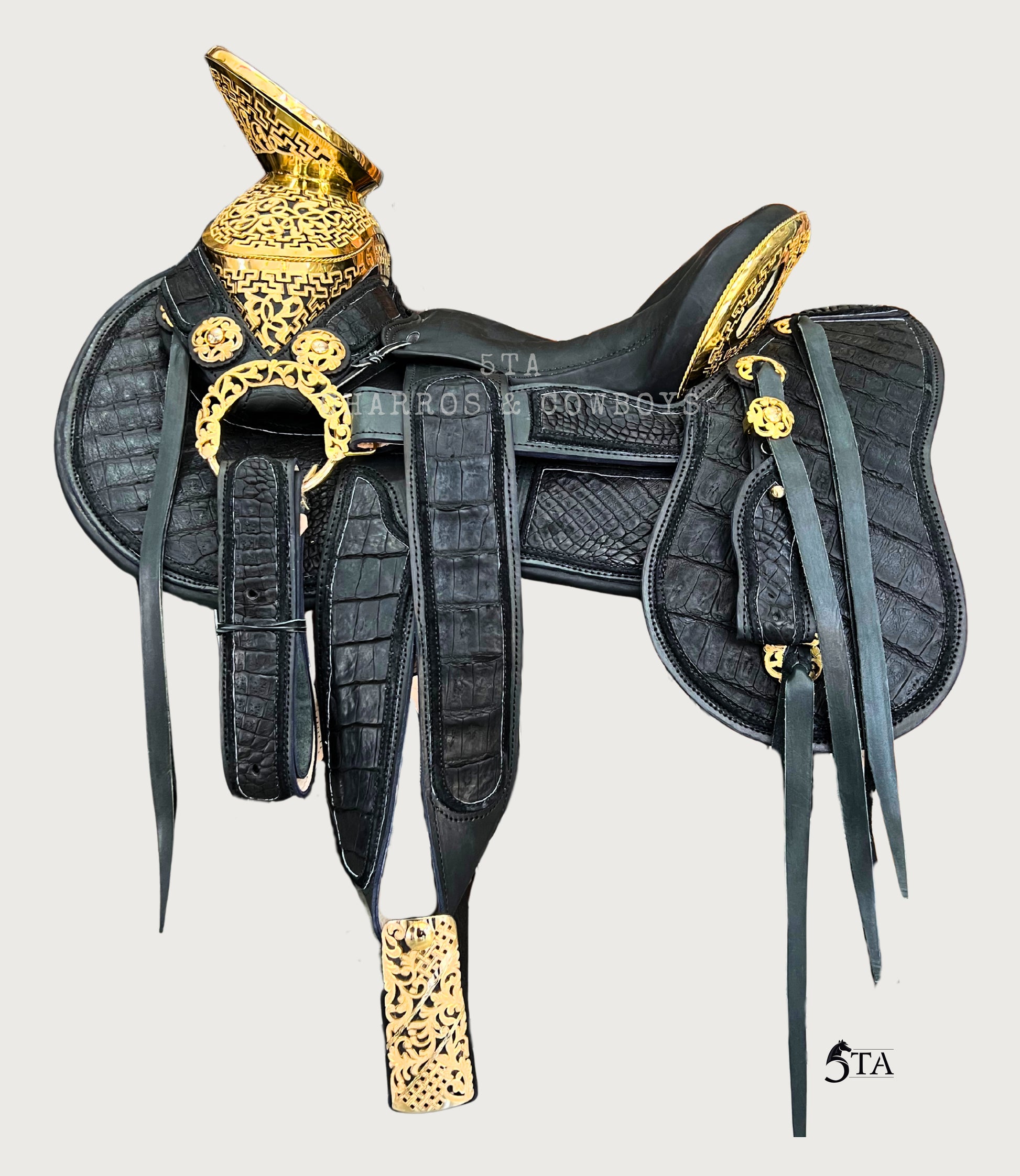Esta montura charra está elaborada con piel auténtica de cocodrilo, garantizando durabilidad y una textura exclusiva. Su herraje está cuidadosamente chapado en oro de 24 quilates, aportando un acabado elegante y resistente. Diseñada para quienes buscan una pieza única, combina tradición y sofisticación, ideal para destacar en cualquier evento charro con estilo y distinción.