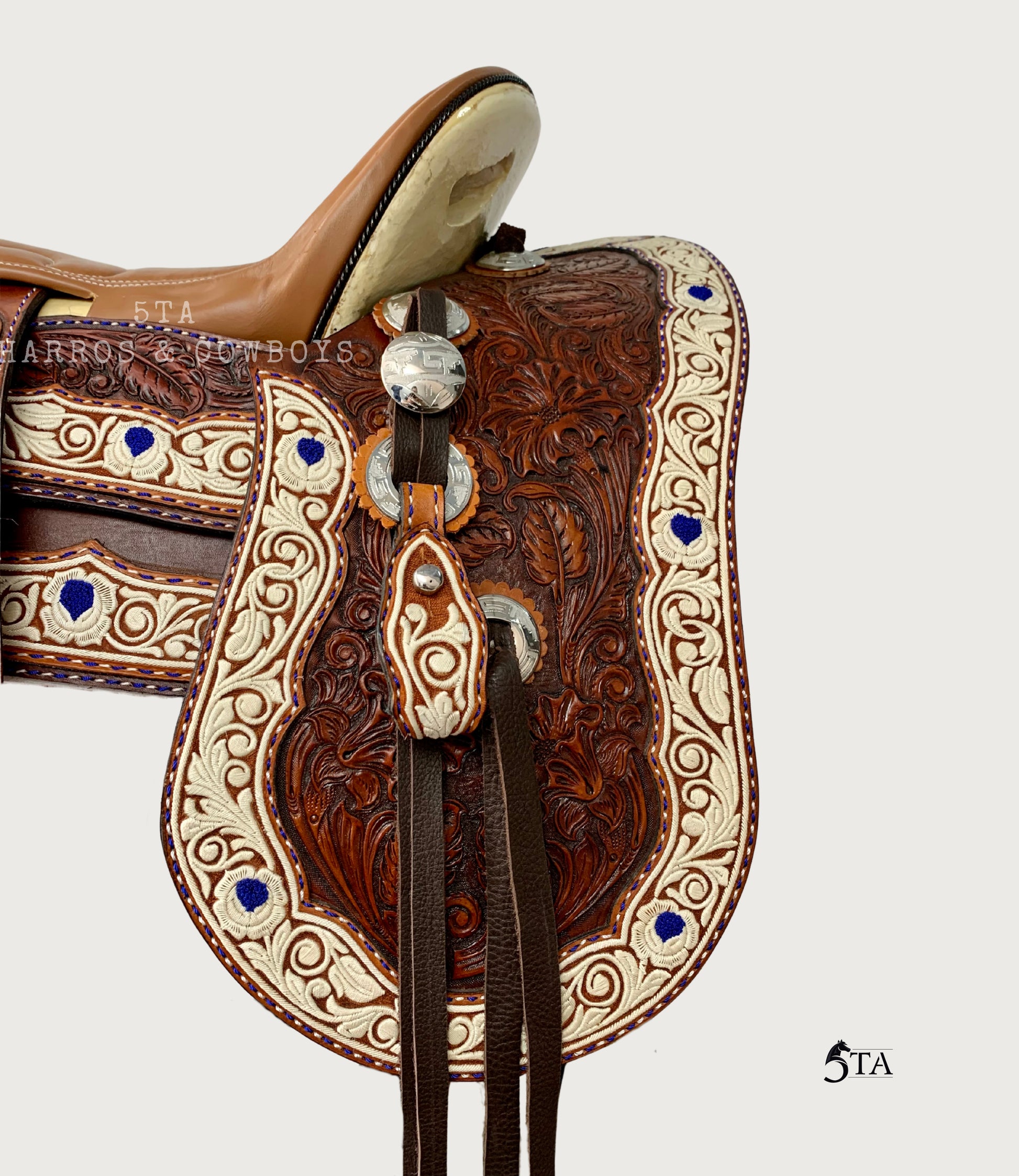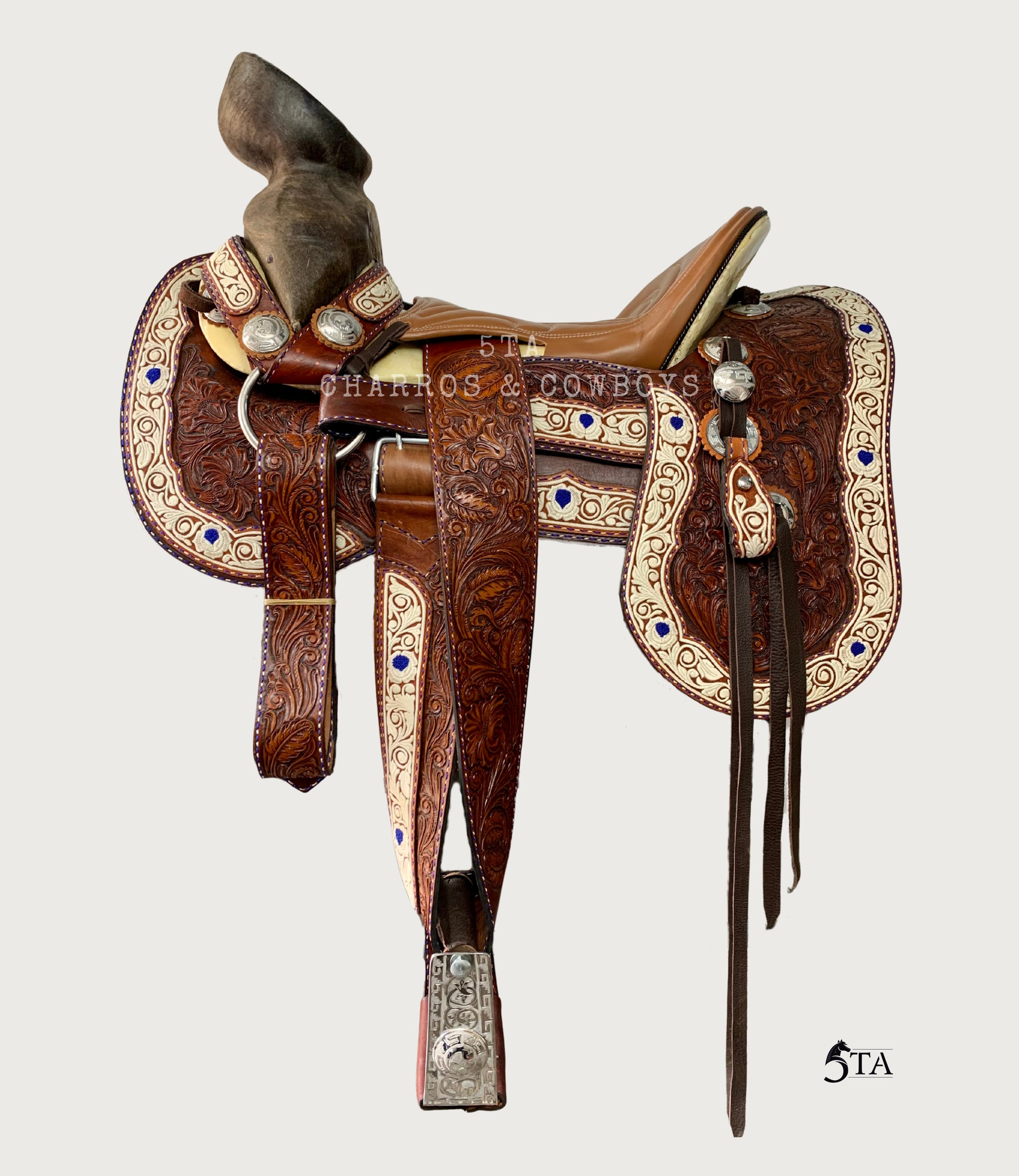 Esta montura charra combina cincelado premium con materiales originales, ofreciendo un estilo auténtico y tradicional. Sus herrajes de acero inoxidable garantizan durabilidad y resistencia, mientras que el piteado original y la costura a mano con dos hilos aporta un detalle artesanal único. Ideal para quienes buscan calidad y elegancia en cada detalle de su equipo charro.